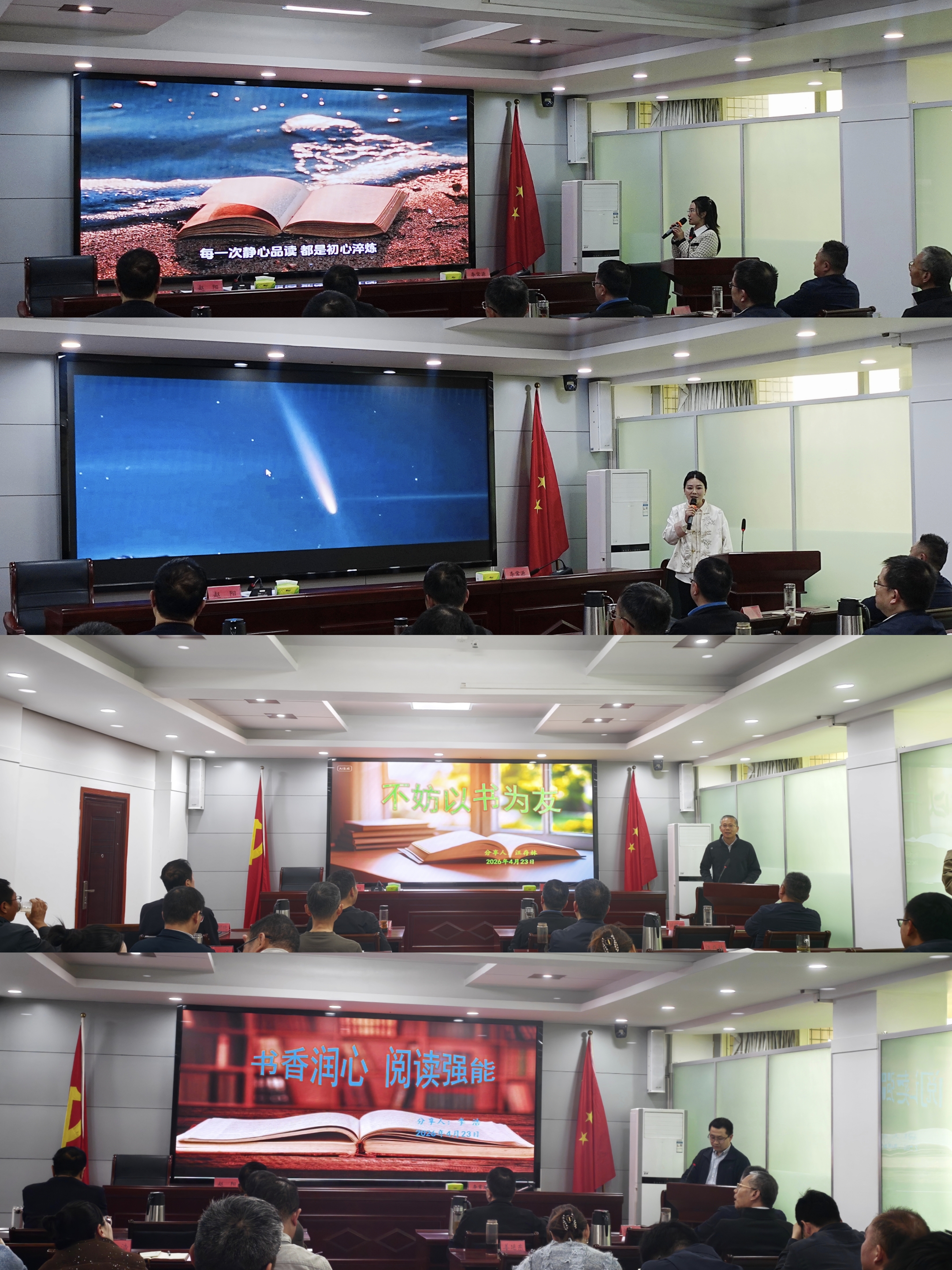 进入分享交流环节,干部职工踊跃登台,结合人生阅历、岗位职责等,分享读书心得,现场氛围热烈。办党组书记、主任赵阳为全体人员分享新华社美文《一定要大量读书,书读多了,人真的会变》,引发大家的强烈共鸣;综合科孙小英围绕品读经典砺初心、书香聚力强国防作主题分享,号召以阅读涵养家国情怀、厚植国防意识、勇担国动使命;审批服务科李琰饱含深情朗诵郭沫若经典诗作《天上的街市》,以文学之美浸润心灵,在诗意诵读中感受文字力量;指通科汪存林以《不妨以书为友》为题,结合自身求学时光、军旅生涯、单位履职三个成长阶段,分享读有字之书、悟无字之理的学习心得,传递终身学习、知行合一的阅读理念;信保中心李浩以《书香润心 阅读强能》分享感悟,结合《平凡的世界》谈心灵滋养,结合《国防论》感悟家国担当与国防初心,并从阅读习惯、书籍选择、读后转化等方面,提出读书建议。